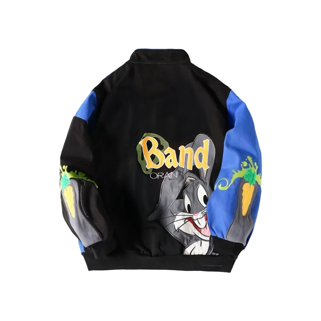 Destaca tu estilo urbano con esta chaqueta Racing de Bugs Bunny, en color negro, con bordados y apliques que resaltan el icónico personaje de manera divertida y moderna. Perfecta para fans y para quienes quieren un look audaz y lleno de personalidad.